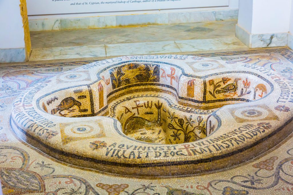 Découvrez une piscine baptismale très semblable, du baptistère de Kélibia (Tunisie), datée du VIe siècle et conservée au musée national du Bardo, à Tunis.