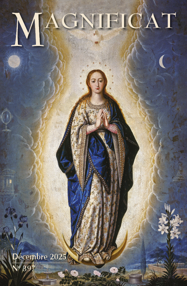 En 1617, le pape Paul V met fin aux controverses théologiques touchant à l’immaculée conception de la Vierge Marie. S’il n’en proclame pas le dogme (ce que fera Pie IX, en 1854), il n’en intime pas moins le silence à tous ses opposants. C’est pour saluer cette décision que frère Juan entreprend de peindre l’œuvre qui, en ce mois de décembre, orne la couverture de votre Magnificat. Marie y est manifestée comme l’Immaculée Conception, de face, comme émanant de la lumière céleste par l’opération de l’Esprit Saint qui la surplombe. Elle est représentée comme la femme de l’Apocalypse : Un grand signe apparut dans le ciel : une Femme, ayant le soleil pour manteau, la lune sous les pieds, et sur la tête une couronne de douze étoiles (Ap 12, 1). C’est une jeune fille aux cheveux d’or, admirablement vêtue. Autour d’elle, la nuée par laquelle Dieu manifeste sa gloire forme une mandorle. La scène se déroule au-dessus d’un paysage qui représente la campagne de Grenade où se discerne à gauche la chartreuse, puis les remparts de la ville (tels ceux de la Jérusalem céleste) et, en arrière-plan, les contreforts de la Sierra Nevada. Dans ce paysage, en bas au premier plan mais aussi dans les nuées célestes aux bords droit et gauche du tableau, l’artiste a représenté seize des attributs mystiques qui célèbrent les perfections de l’Immaculée, tels qu’ils étaient chantés dans des Litanies qui aboutirent finalement aux Litanies dites de Lorette. En partant d’en haut à notre gauche (le soleil), puis en passant par le premier plan en bas, pour finir en remontant jusqu’en haut à notre droite (la lune), en voici la liste :
