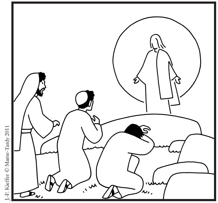 Pierre, Jacques et Jean, trois disciples qui sont proches de Jésus, vont vivre une expérience très forte : Jésus est transfiguré, il devient d’une blancheur éclatante, devant eux. Il resplendit déjà de la lumière de la Résurrection. Ils sont bouleversés !