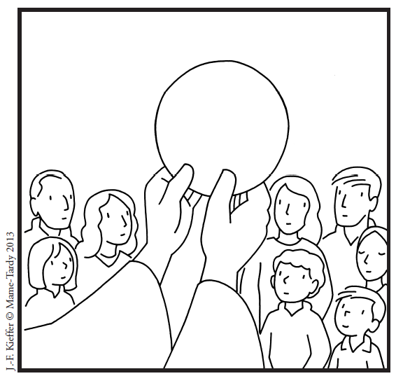 - Un peu avant la communion, le prêtre élève l’hostie et, en la montrant à tous, il dit : « Voici l’Agneau de Dieu qui enlève le péché du monde. » Dans l’hostie consacrée, Jésus est là comme un agneau qui donne sa vie pour nous sauver du péché et nous donner la paix et la vie de Dieu.