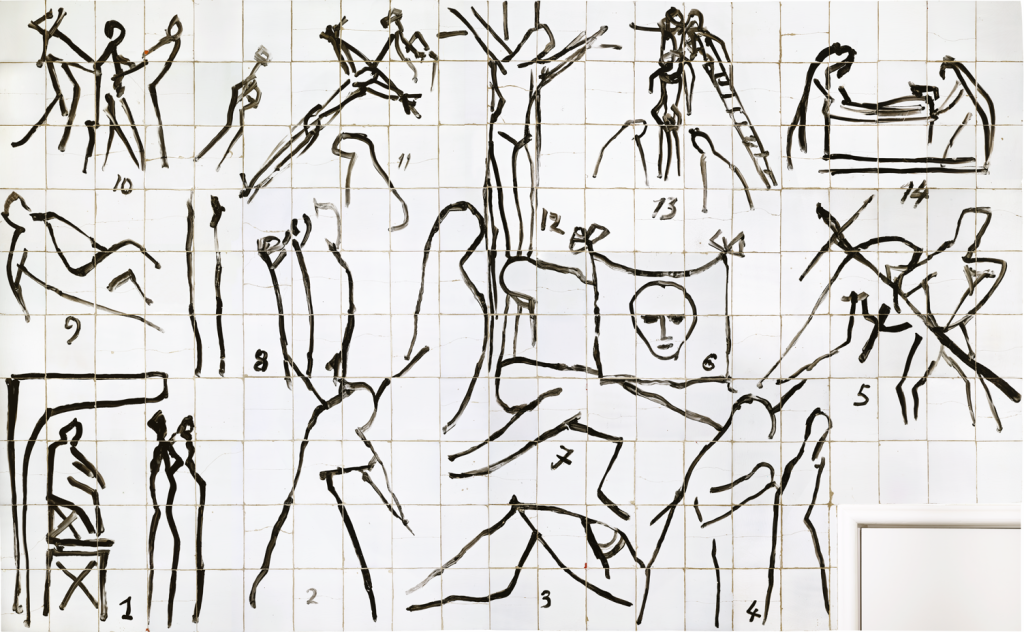 Étude pour la 14e station, 1948, pinceau et encre sur papier, 26,2 × 20,2 cm. Collection particulière. Photo : DR. Chemin de croix, Vence, 1951, chapelle du Rosaire, décor émaillé noir au pinceau sur carreaux de faïence blanche. Photo : DR.